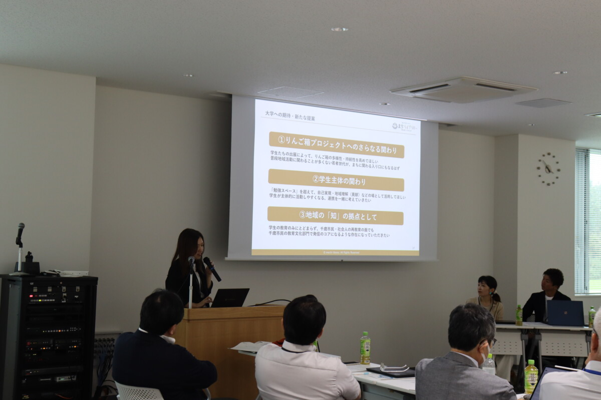 2025年度の連携ネットワーク会議が9月11日(木)、情報棟を会場として開催されました。当日は構成17団体中の14団体21名の皆さまにご参加いただき、その中から「まちライブラリー@ちとせ」の若女将 依岡琴乃様、「千歳青年会議所」の理事長 大久保景右様、「チトセコ」の代表 角谷 日花里様に各団体を代表しての活動事例を発表していただきました。