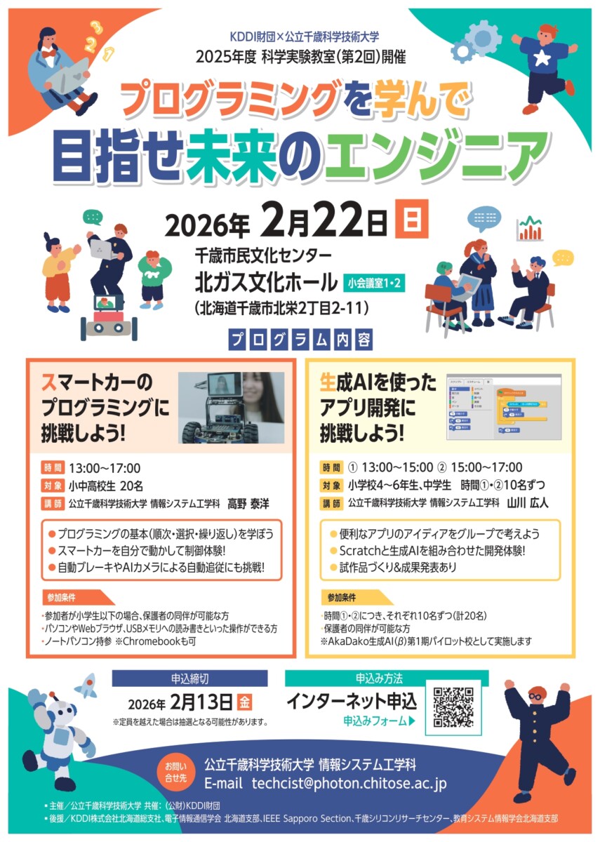 【KDDI財団×公立千歳科学技術大学】2025年度科学実験教室(第2回)を開催します Date:2026.02.02 2025年度科学実験教室(第2回)を開催します。 詳細・応募は下記リンクより ▼2025年度科学実験教室(第2回) 記事一覧へ 前の記事へ